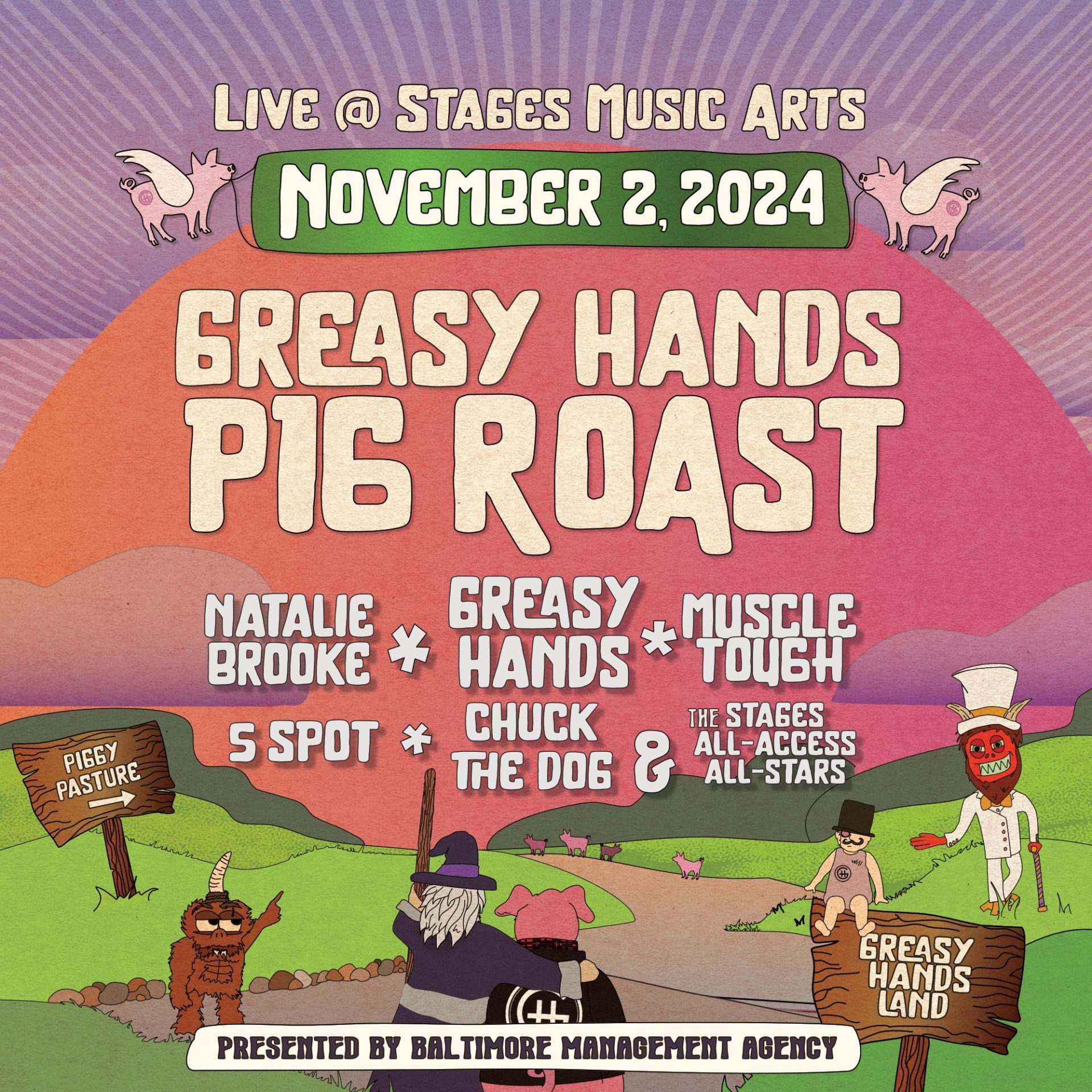 Join us for the 2nd annual Greasy Hands Pig Roast presented by Baltimore Management Agency and Stages Music Arts. We can’t wait to get back to Baltimore County for another year filled with delicious BBQ, food & craft vendors, family friendly vibes, and a killer lineup of regional music, including Greasy Hands, Natalie Brooke, Muscle Tough, 5 Spot, Chuck the Dog and Stages All-Access All Stars. Door at 2 pm, music from 3 pm – 12 am.